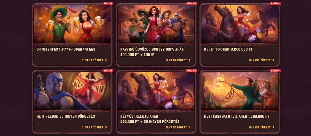A heti reload promóció 50 ingyenes pörgetést kínál a játékosoknak, amelyek megszerzéséhez a minimum befizetés 8000 Ft. Ha megkaptad az ingyenes pörgetéseket, 7 napig van időd a felhasználásukra, és onnantól kezdve, hogy aktiváltad őket, 10 nap áll a rendelkezésedre a megforgatási követelmény teljesítésére, ami 40x.